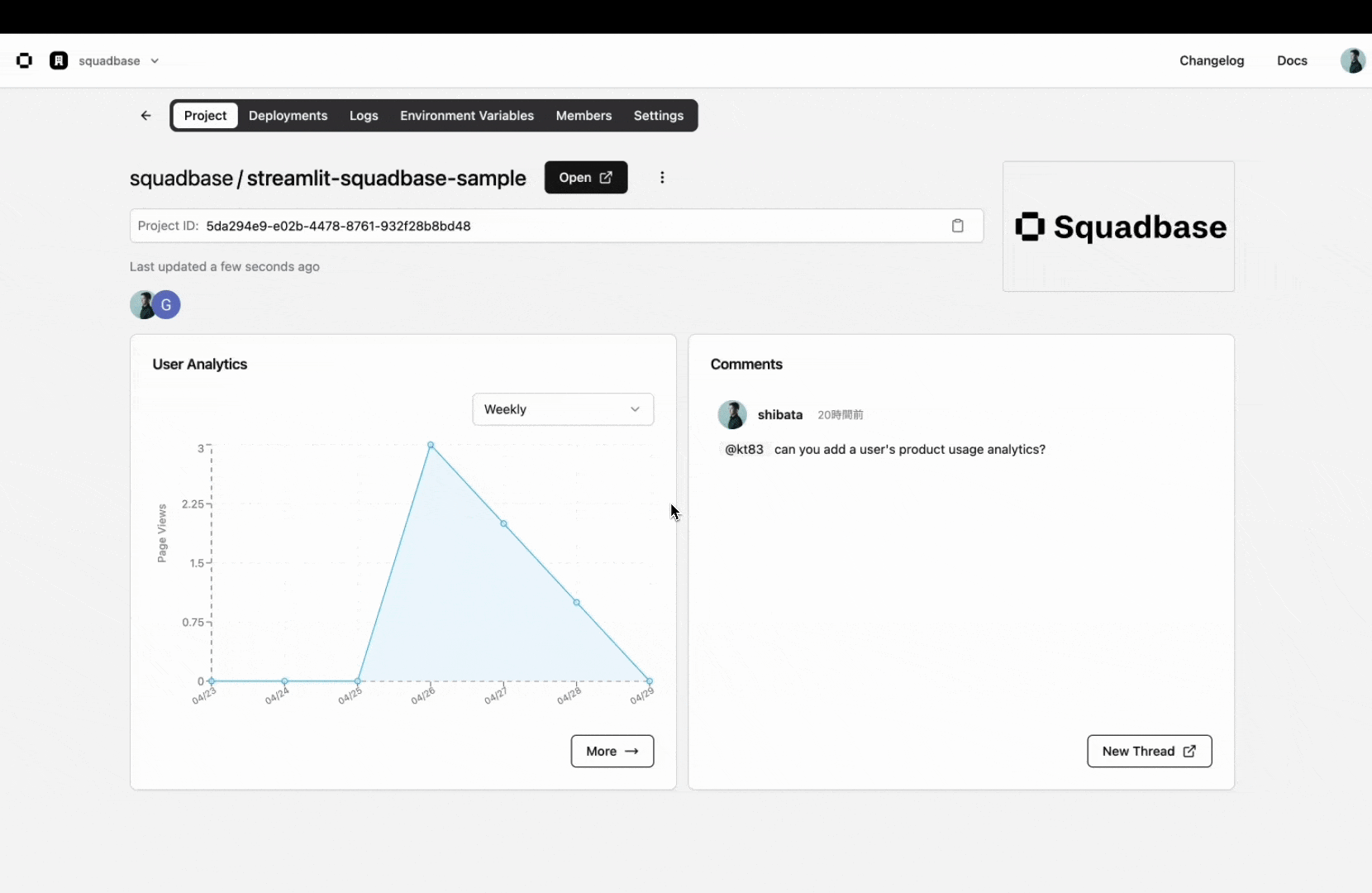 Squadbase can automatically inject a feedback comment box into deployed apps. Team members can submit feedback directly, and all responses are aggregated in the dashboard for developers to review and act on.