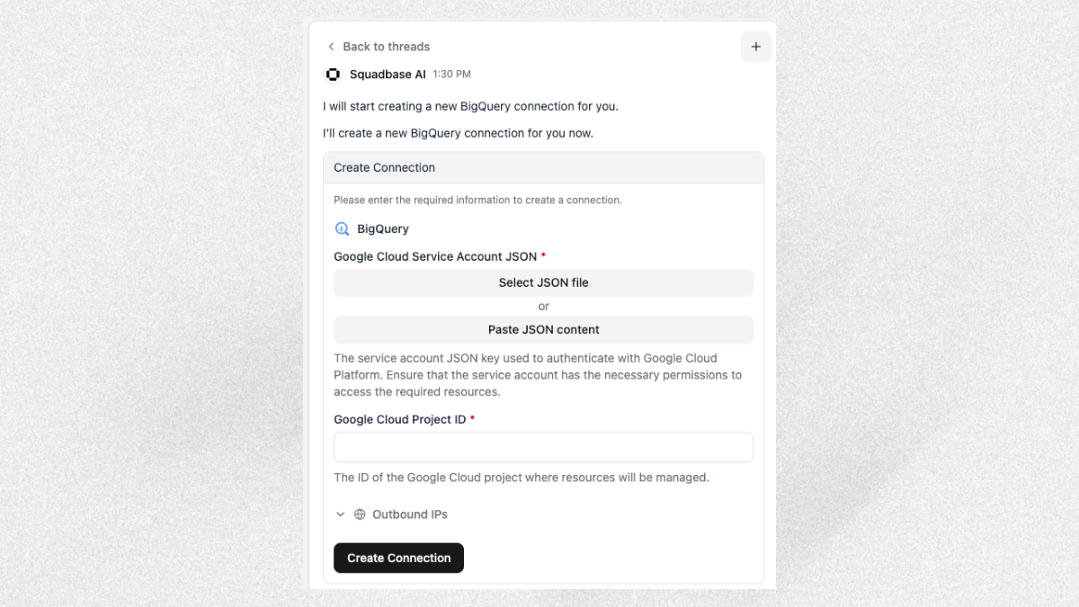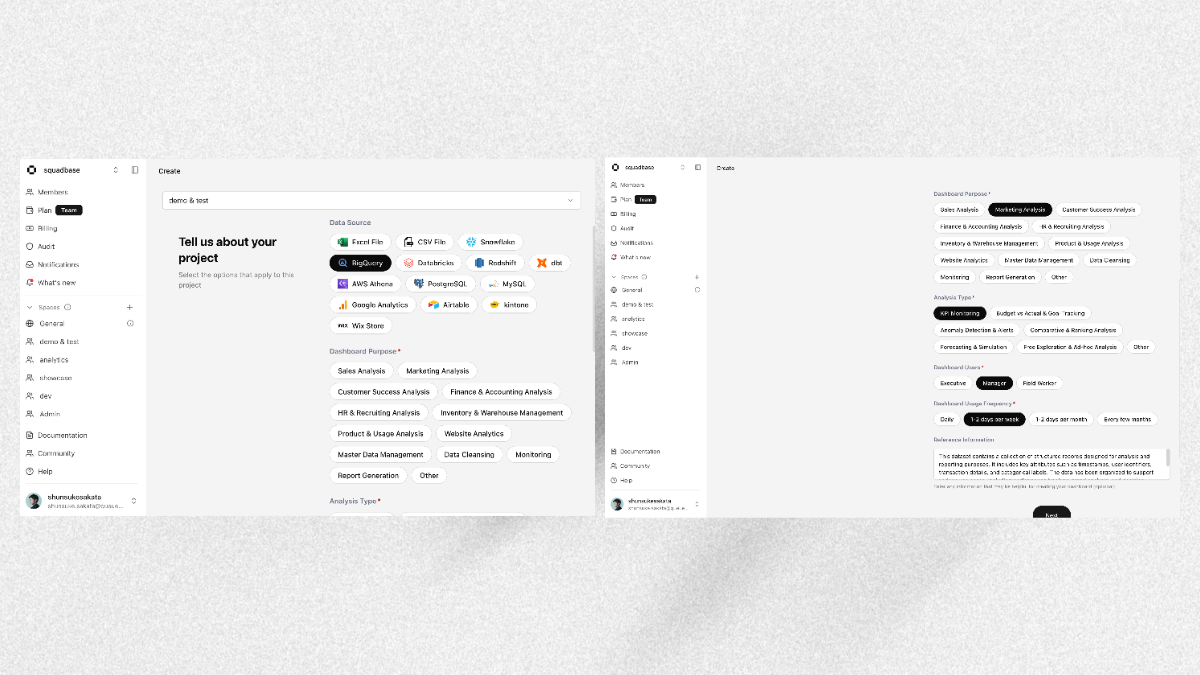 Using the JSON and Project ID obtained in the steps above, you can leverage AI-powered analysis in Squadbase.