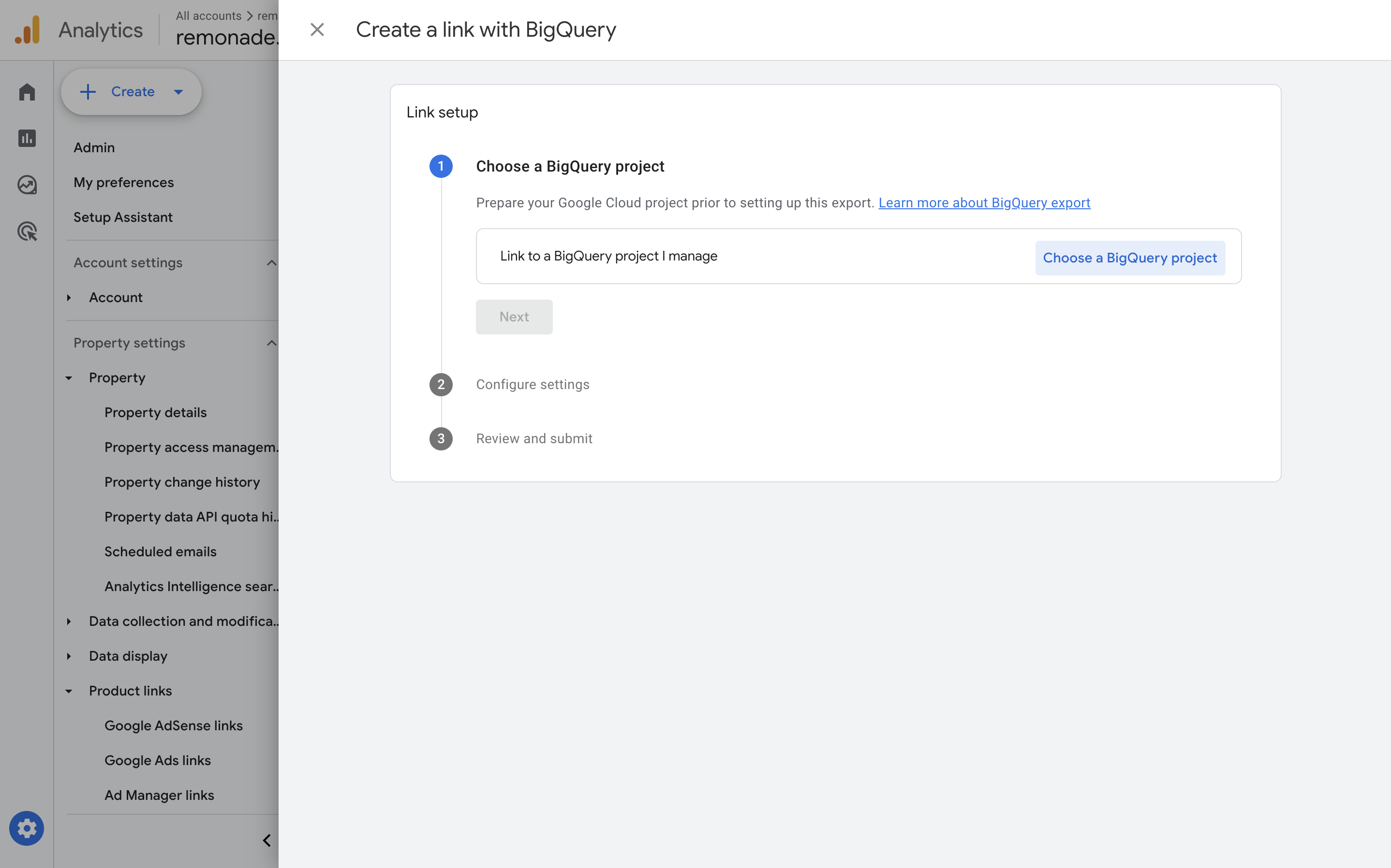 Open GA4 "Admin": Click the gear icon in the bottom left, and select the BigQuery link under Product Links.