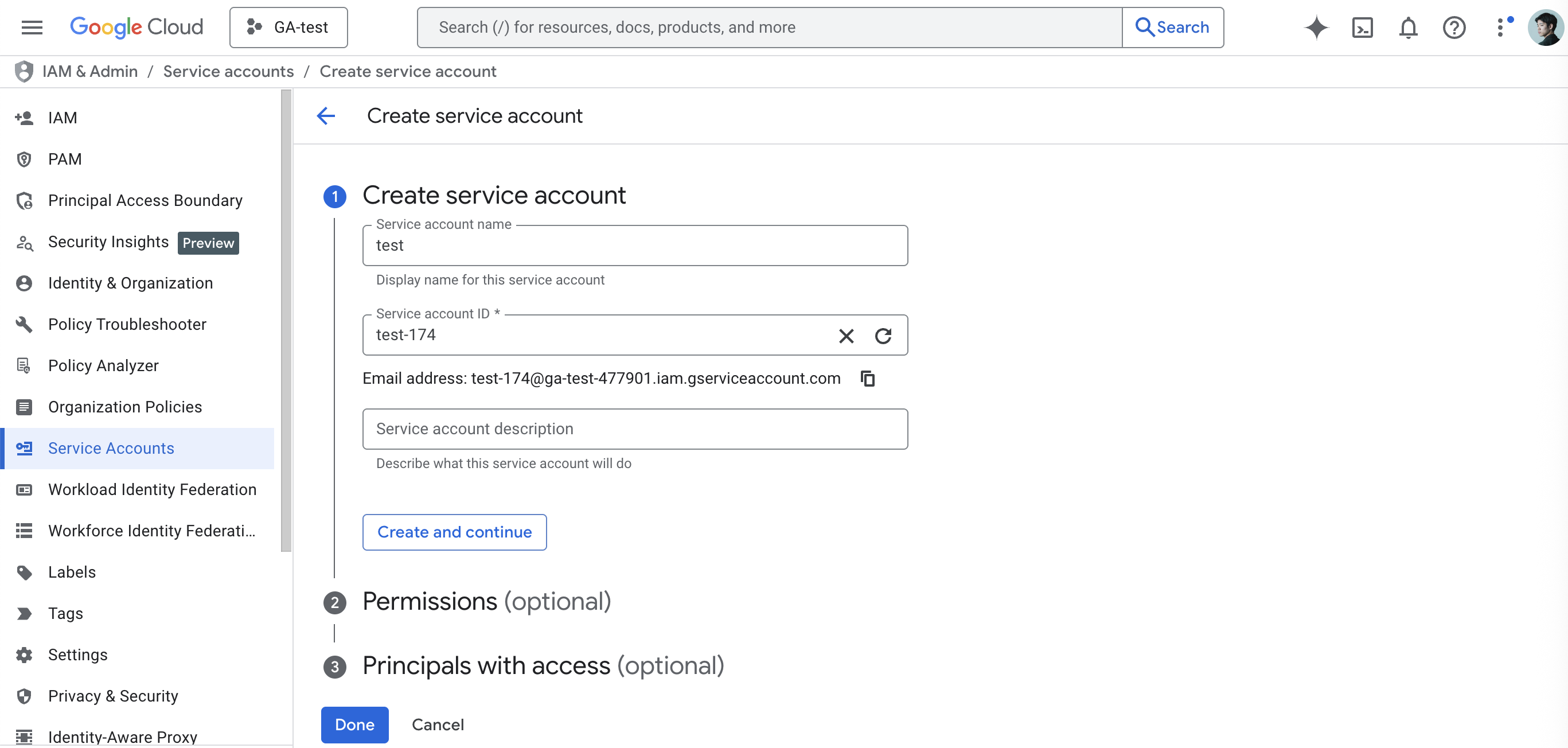 - Service account description: Optionally add a description for this service account.
