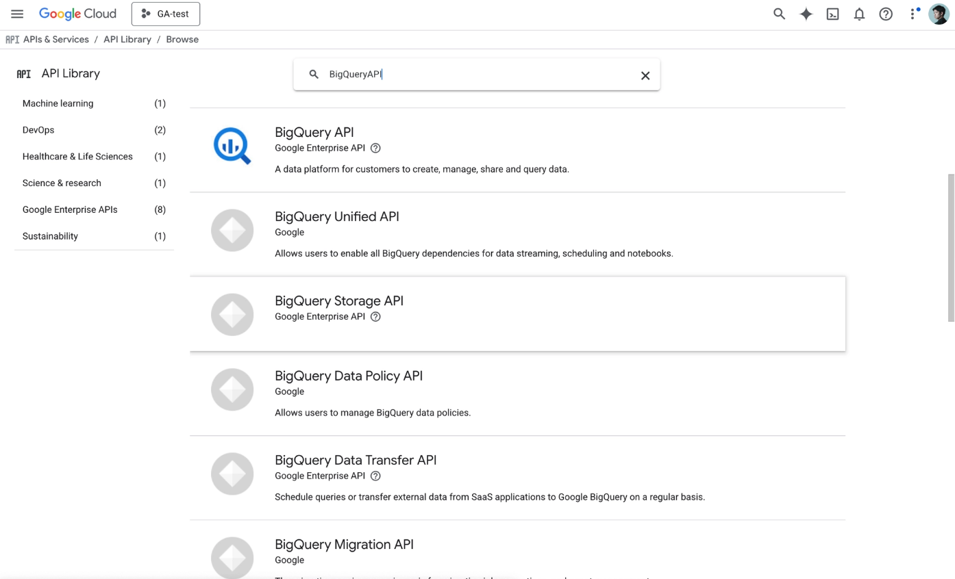 Enable the BigQuery API: From the menu, go to "APIs & Services" > "Library," search for "BigQuery API," and click "Enable."