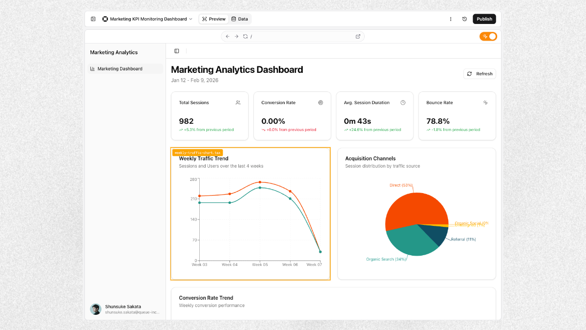 Traditional BI tools typically require familiarity with tool-specific workflows and an understanding of SQL. With Squadbase, all you need is a Google account. From there, the AI suggests the optimal dashboard layout, so you can get started right away—even if you have no idea where to begin.