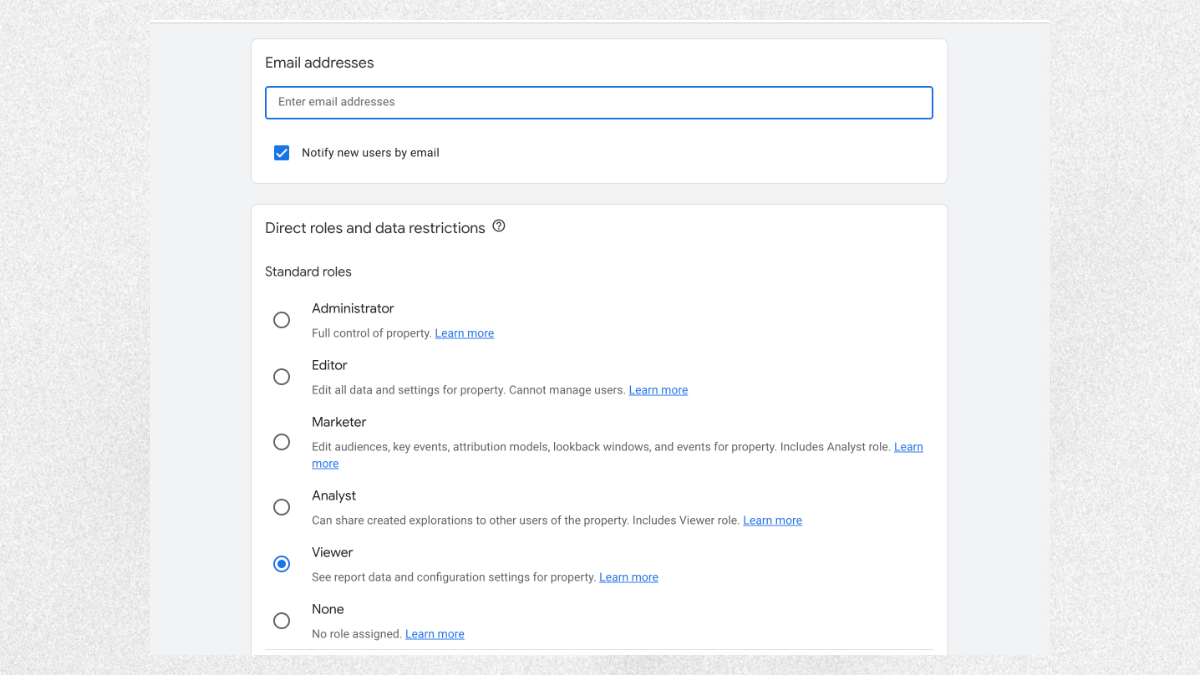 Enter the service account's email address in the Email field and set the permissions to Viewer. (We recommend using Viewer permissions, as Editor or higher permissions could allow data to be modified.)