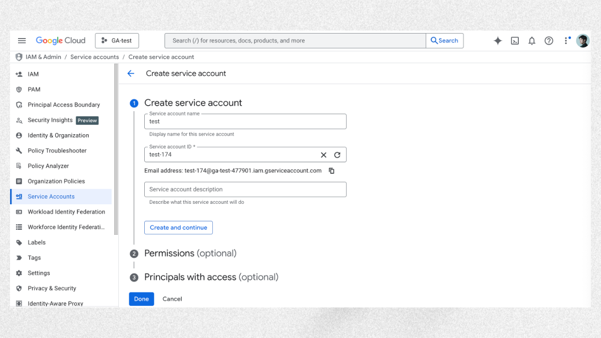 - Service account name: Give it a descriptive name so you can easily identify its purpose.