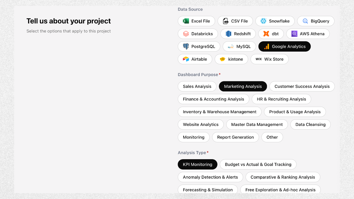 Choose Google Analytics from the Data Source options and answer a few questions about your project.