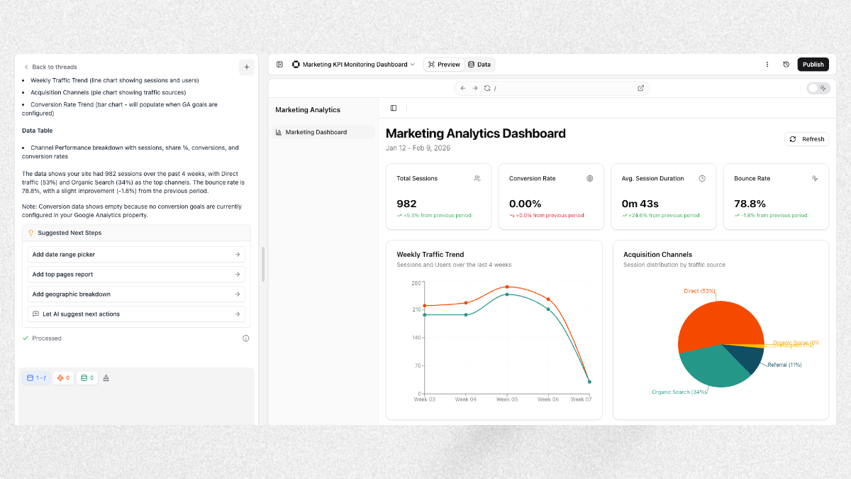 Squadbase is an AI-powered, no-code dashboard creation tool. It integrates with a variety of data sources, including GA4, giving anyone the ability to visualize and analyze data with ease.