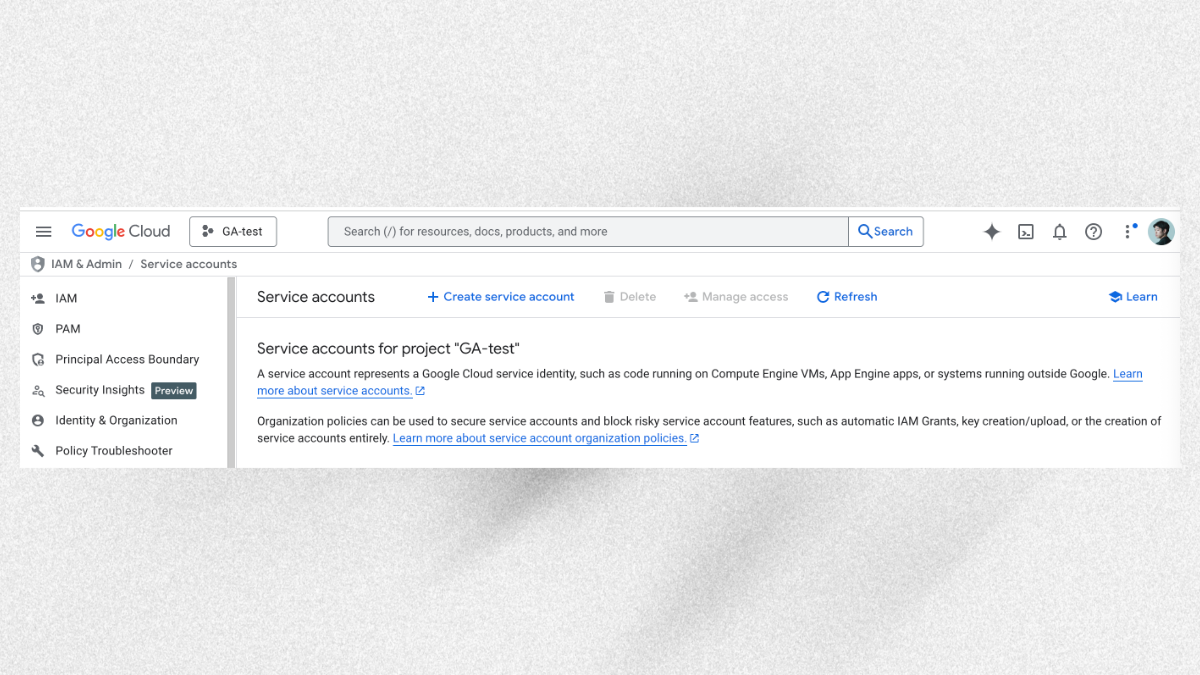 After clicking on Service Accounts, click + Create service account at the top of the screen.