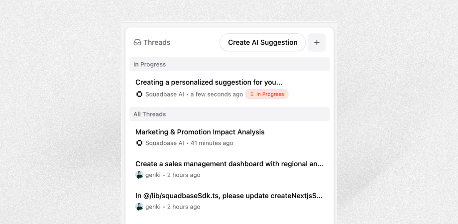 After each completed task, Squadbase AI suggests what to do next. Start new tasks without typing a word, and try ideas you might never have thought of on your own.