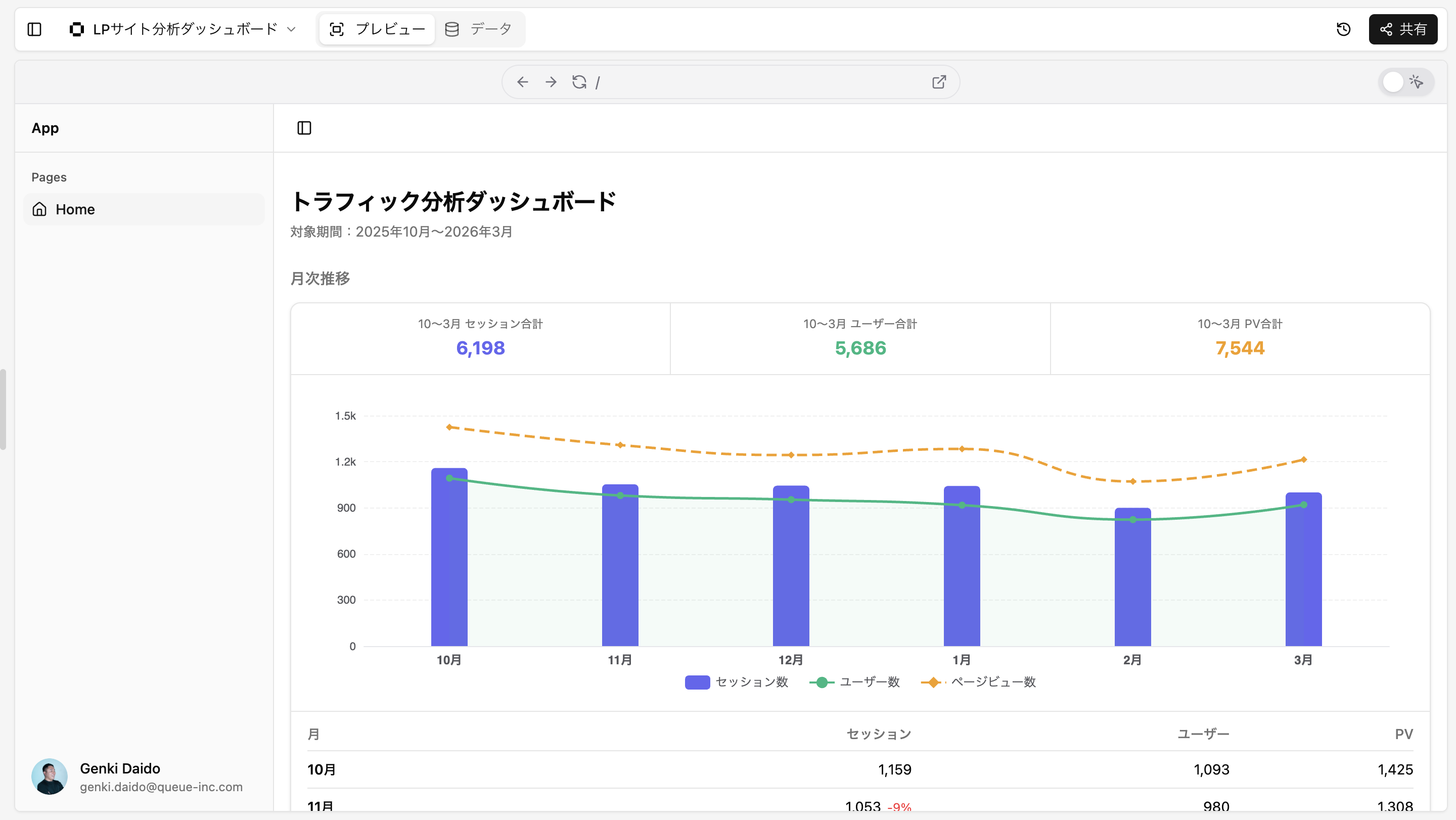GA4を接続したら、エディタのチャット欄に例えば「過去6ヶ月のセッション数・ユーザー数・ページビューの推移をグラフで表示して」と入力します。するとAIがGA4からデータを取得し、月別のトレンドを可視化したダッシュボードを自動で生成します。変化の兆しが、グラフ上で一目で把握できるようになります。