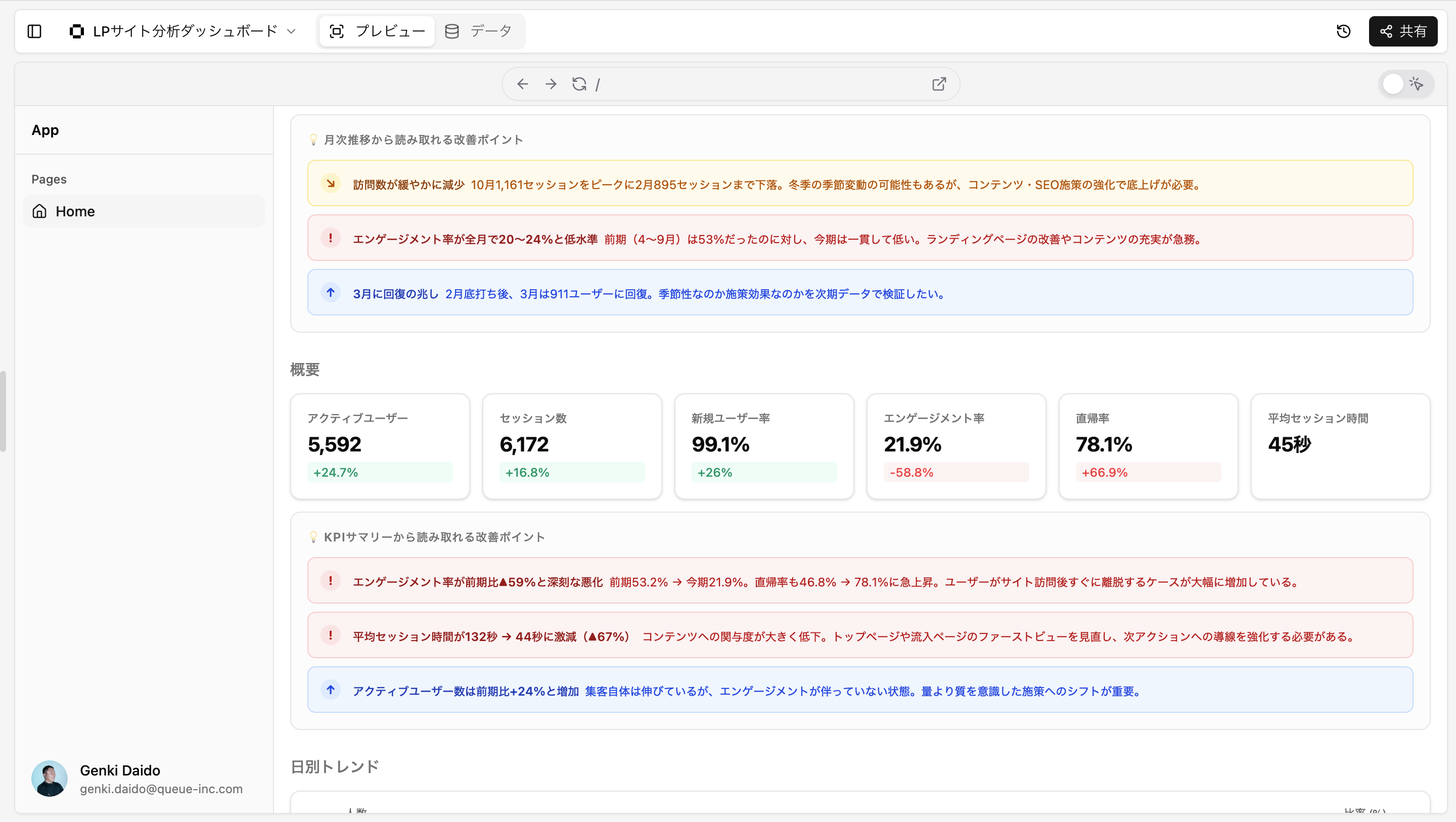 そして「このデータから読み取れる改善ポイントをダッシュボード内にコメントして」と依頼すると、AIがダッシュボード上のデータを読み取り、考察のたたき台を生成します。たとえば「〇〇ページのセッション数は上位だがエンゲージメント率が低い。コンテンツの導線を見直すことで改善が期待できる」「直近2ヶ月でモバイルからの流入比率が上昇傾向にある。モバイル向けのUI最適化を検討すべき」といった具体的な示唆が得られます。