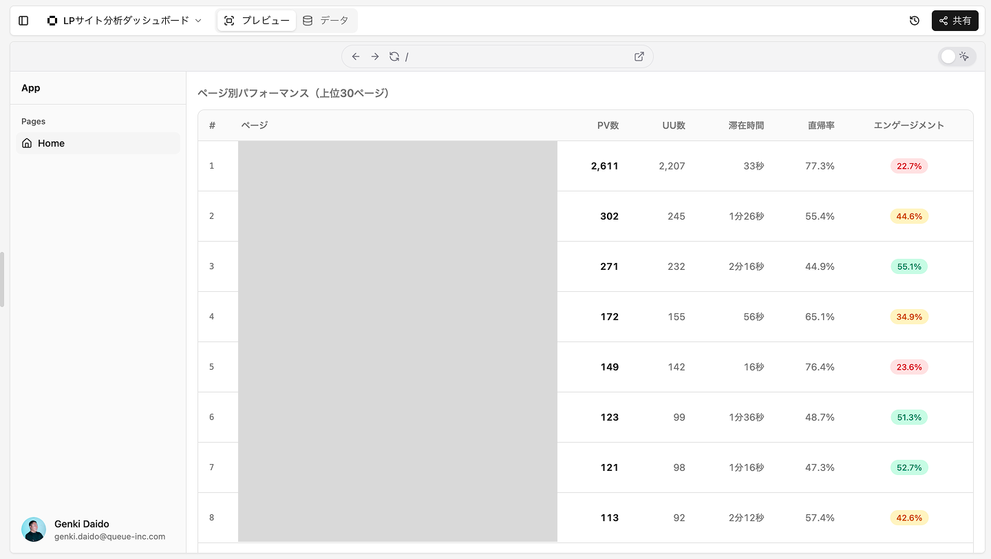 続けて「ページ別のパフォーマンスも追加して、上位30ページまで表示して」と伝えると、ページタイトルごとのパフォーマンスを一覧化したテーブルがダッシュボードに追加されます。従来はGA4の画面を何度も行き来してデータをコピペしていたこの作業が、一言で完了します。どのページがトラフィックを牽引しているのか、逆にどのページが伸び悩んでいるのかが、テーブル上で即座に確認できます。