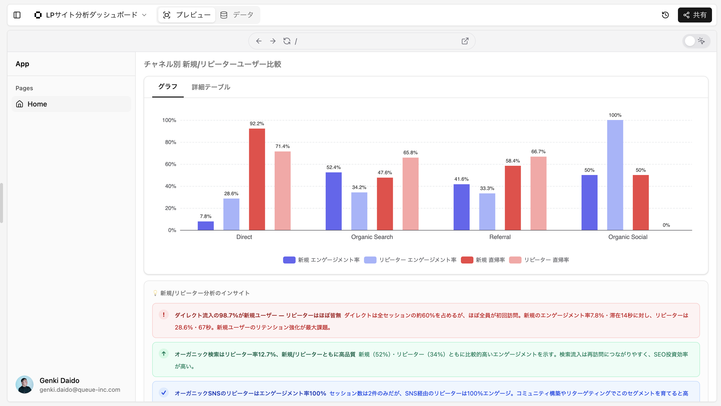 従来であれば、BIツールの設定画面を開いて構成を組み直したり、スプレッドシートのピボットテーブルを作り直したりする必要がありました。Squadbaseなら、チャット欄に「ページ別ではなく流入チャネル別で分析し、新規ユーザーとリピーターを分けて見られるようにして」と入力するだけです。数十秒でダッシュボードが更新され、Organic Search・Direct・Referralなどのチャネルごとに、新規ユーザーとリピーターそれぞれのエンゲージメント率と直帰率を比較する棒グラフが表示されます。