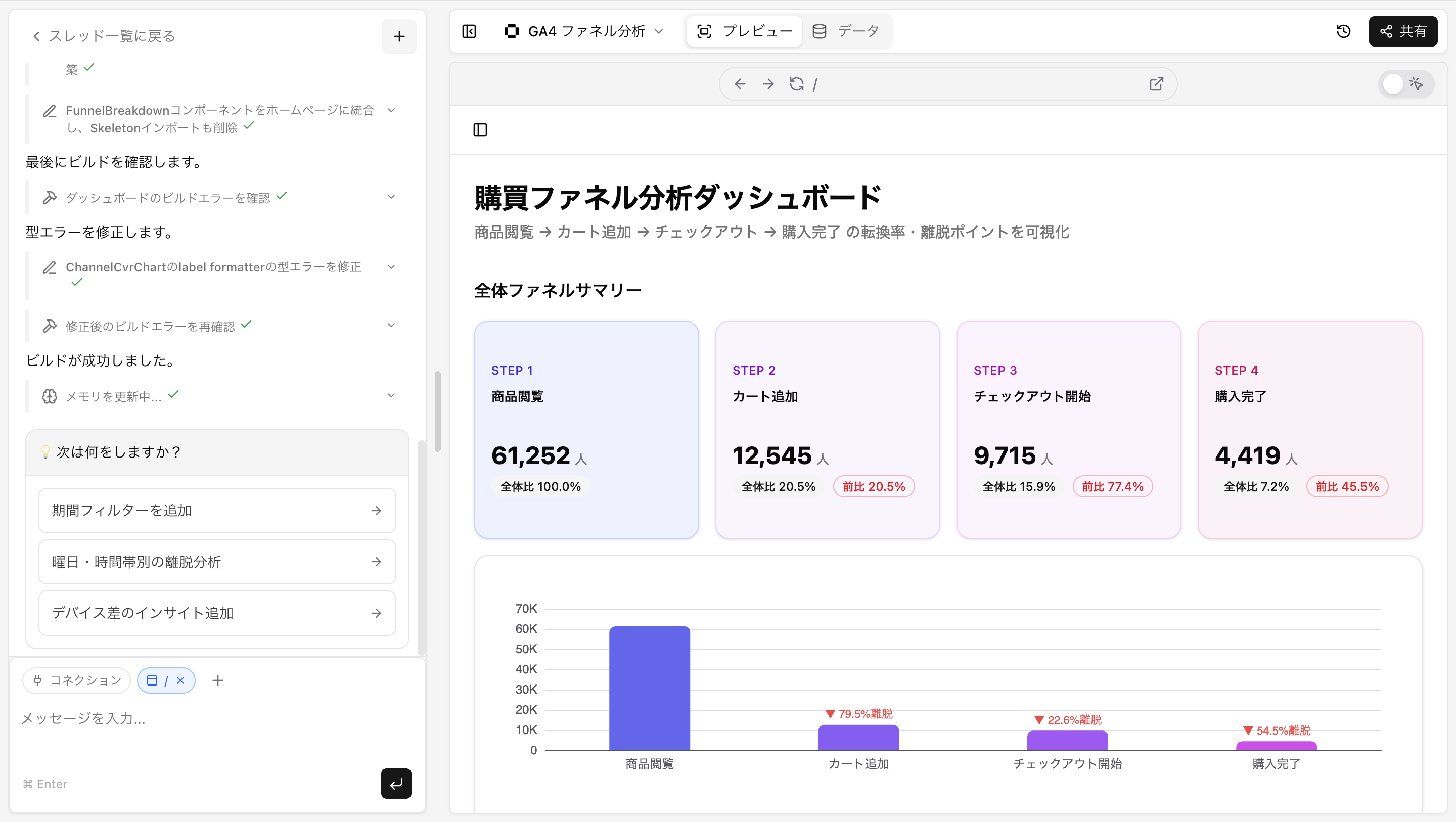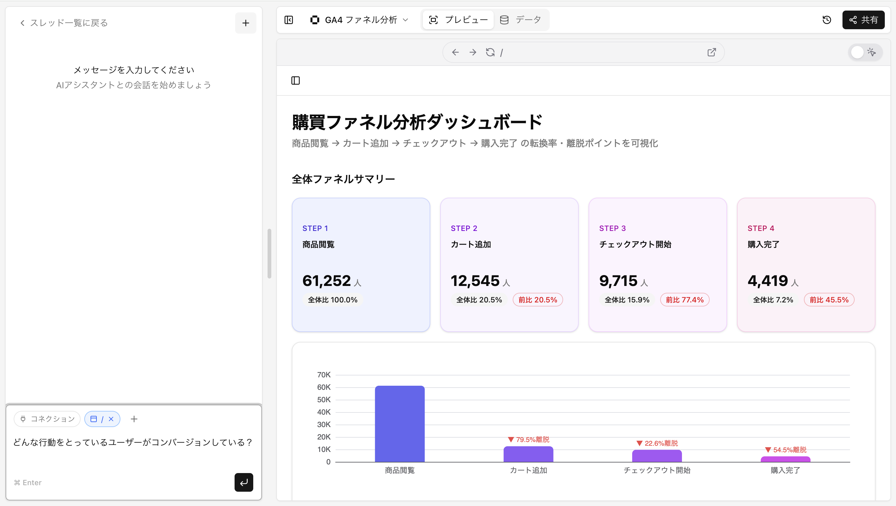 例えばチャット欄で「どんな行動をとっているユーザーがコンバージョンしている?」と聞いてみましょう。